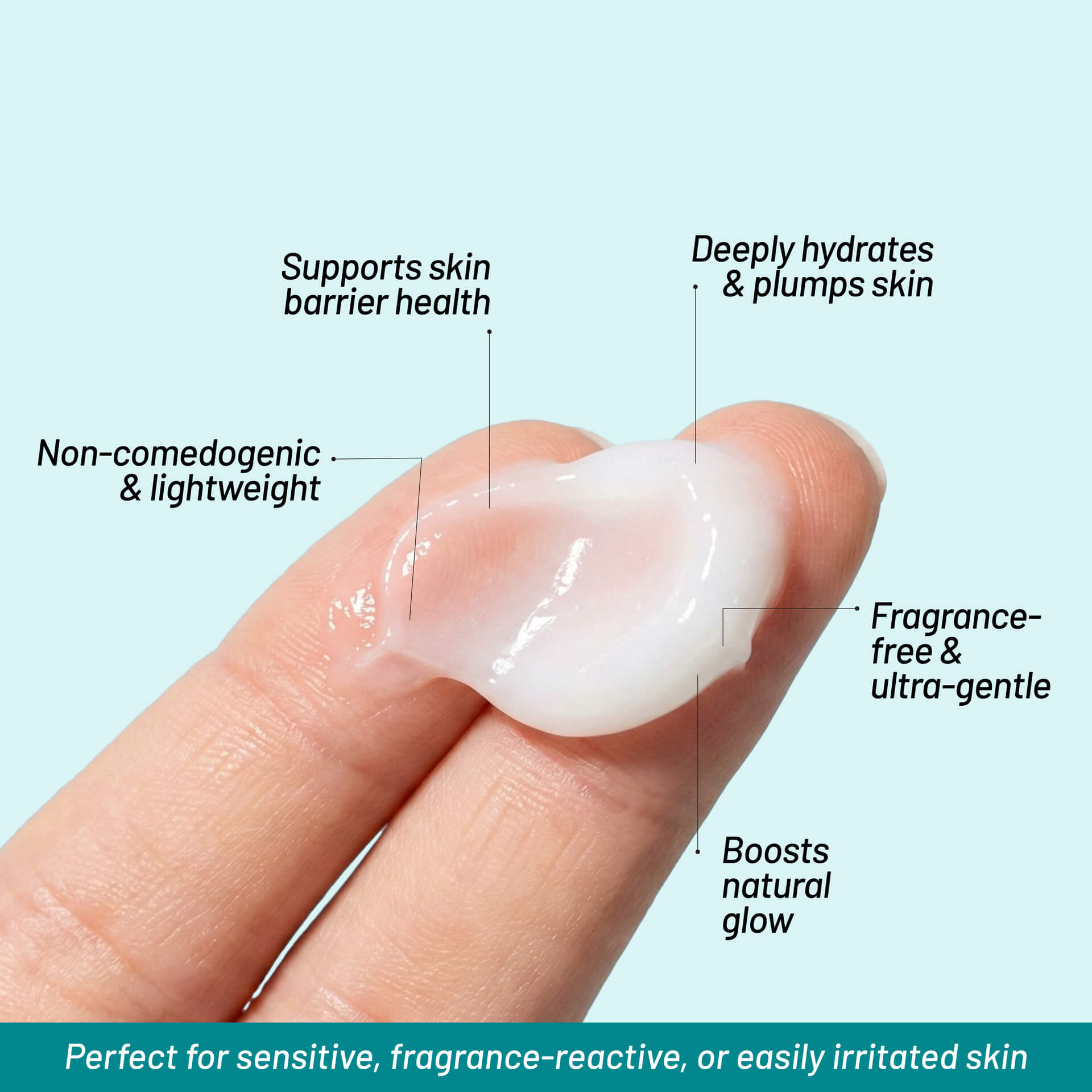 Ultra-gentle fragrance-free moisturizer enriched with Cornflower and Cucumber to deeply hydrate and soothe sensitive skin..